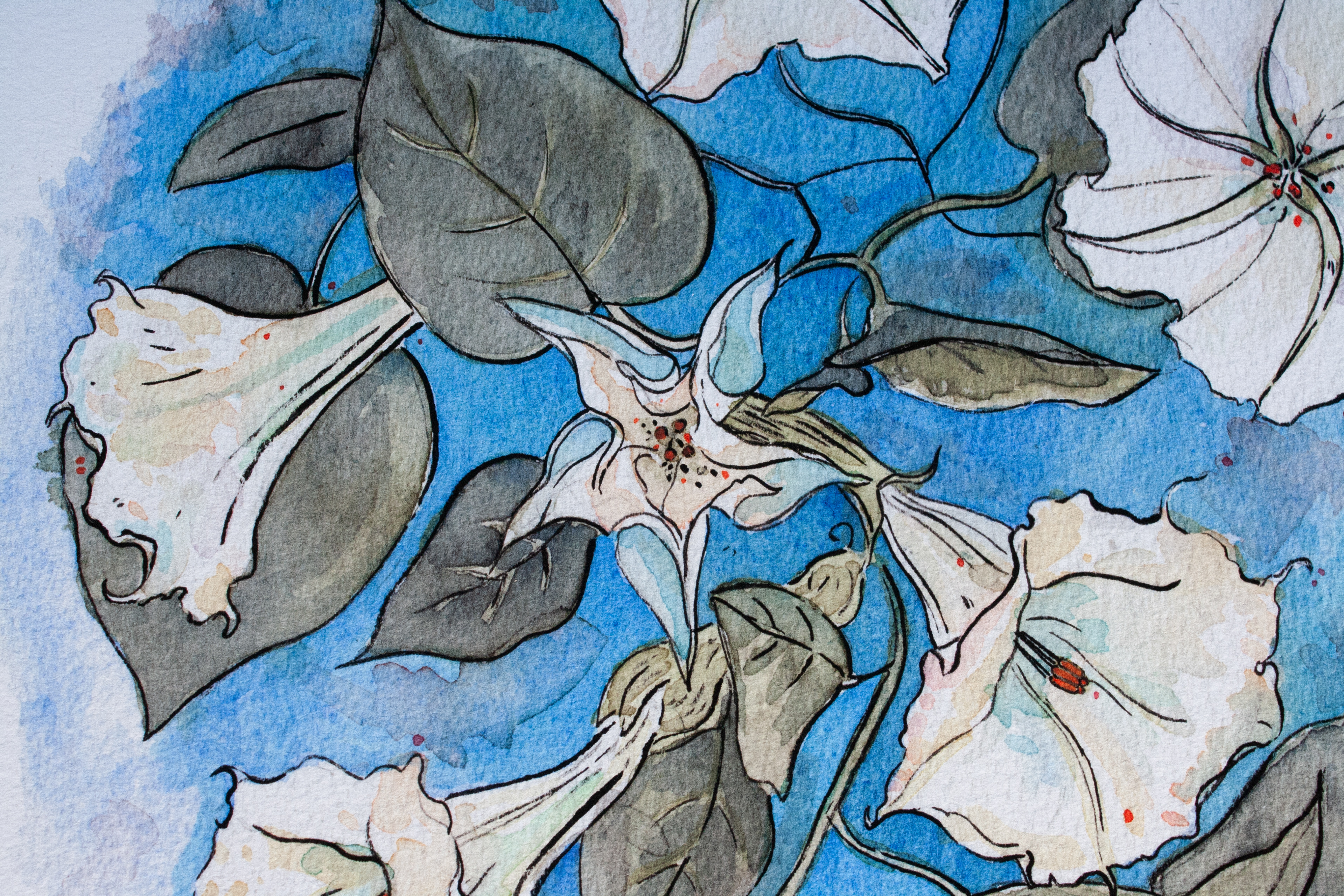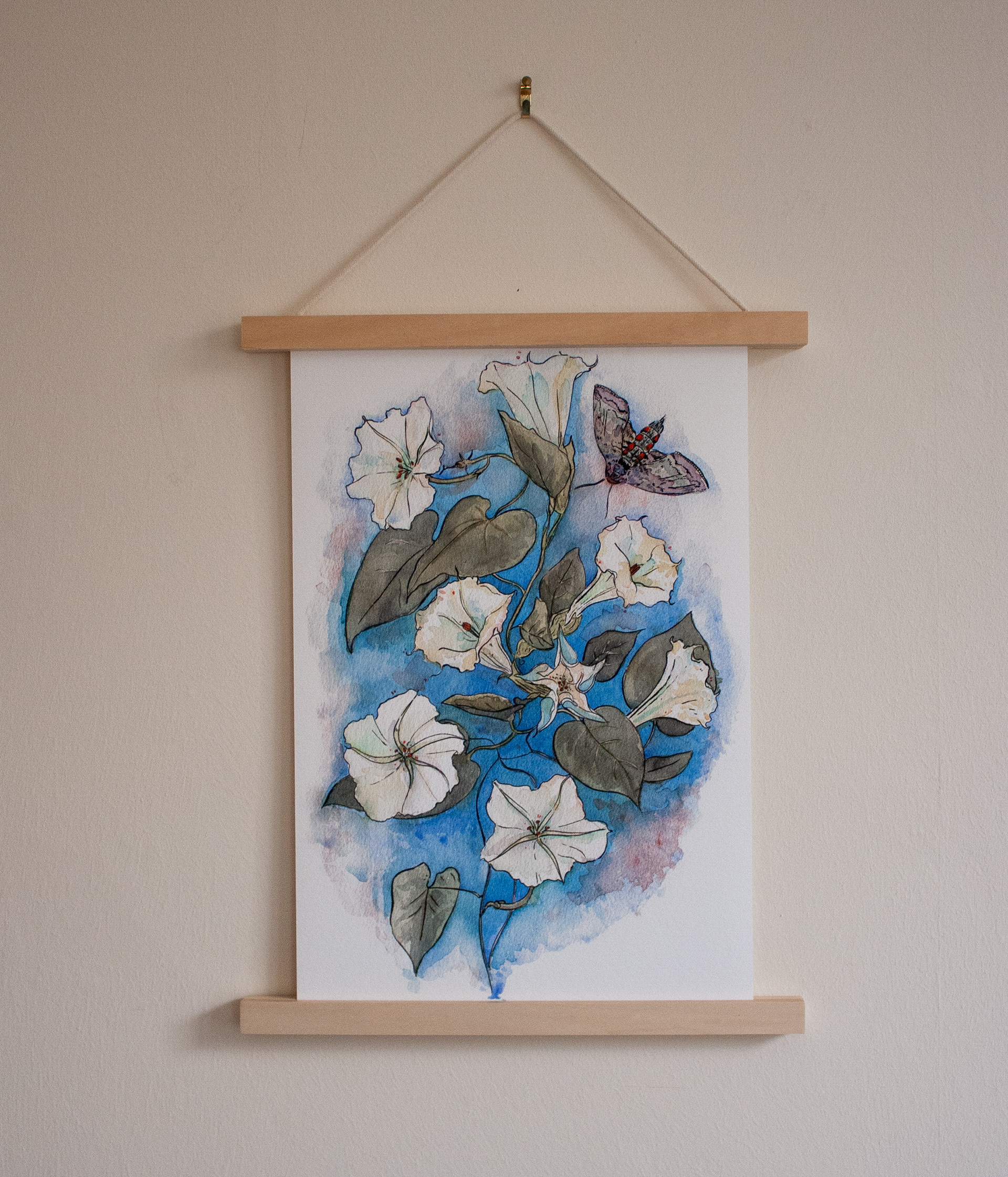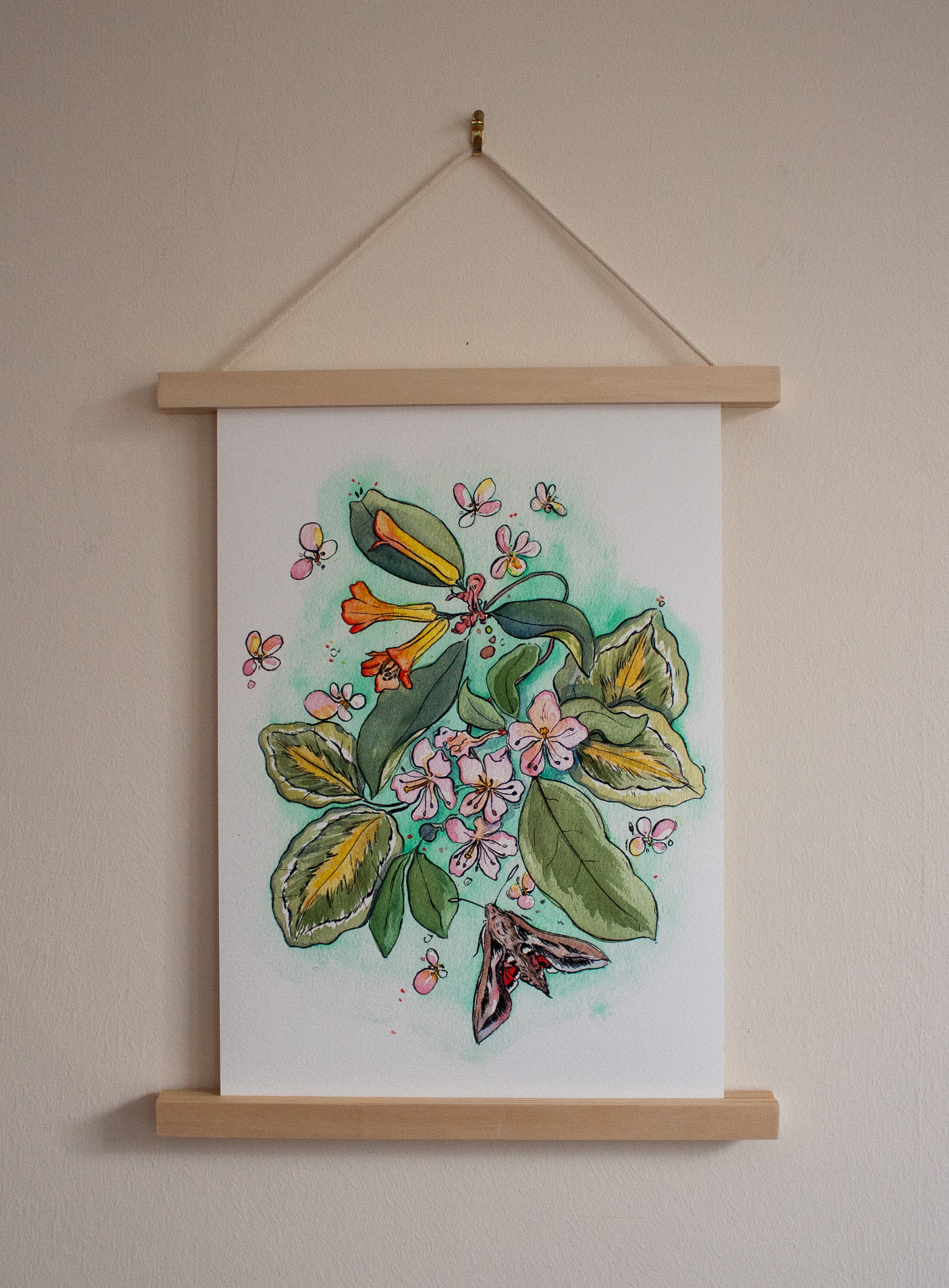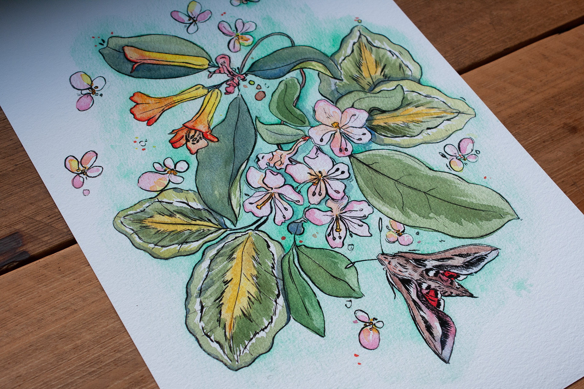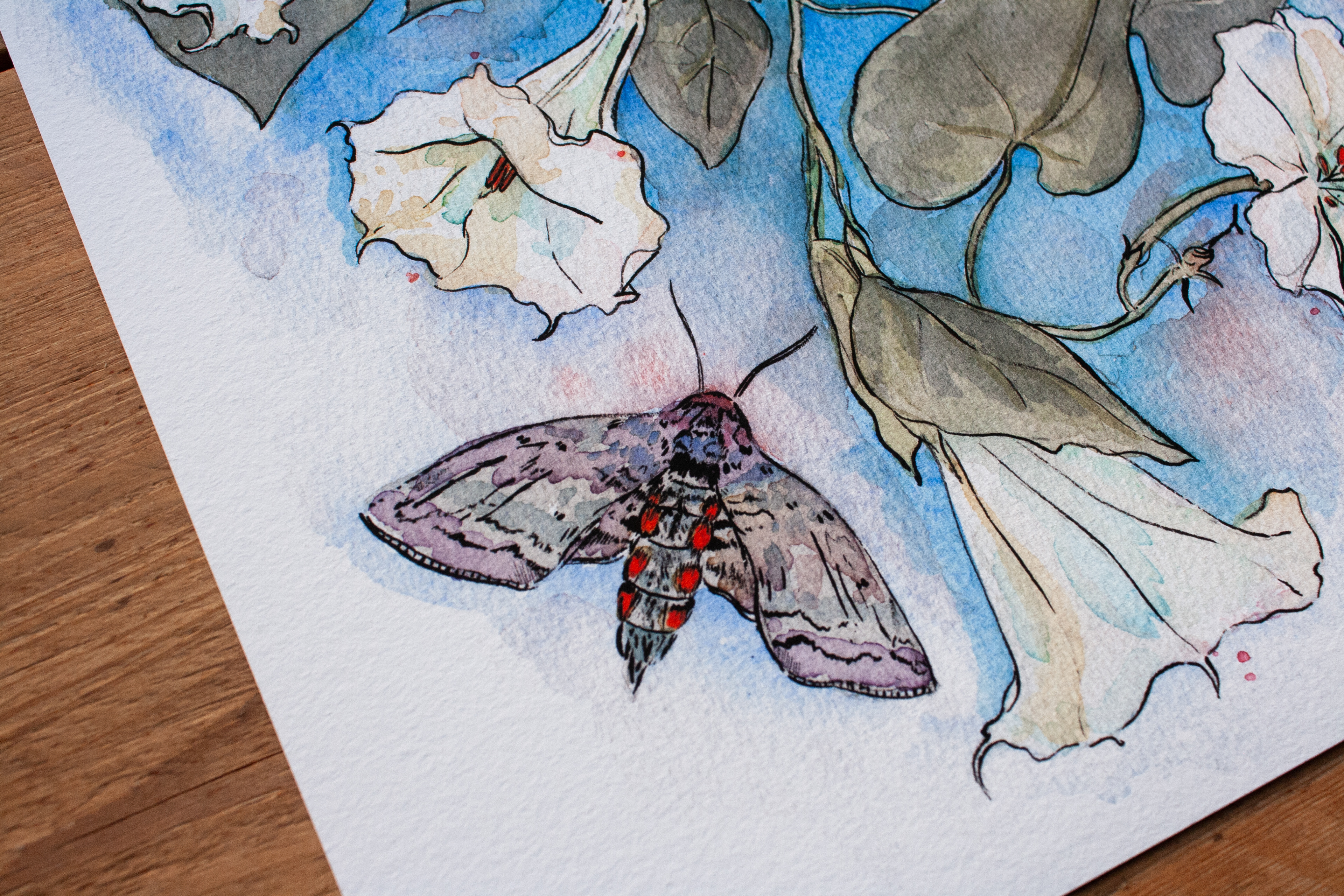Digital print of a watercolour illustration a five-spotted hawkmoth surrounded by moonflowers + a Gallium Sphinx moth surrounded by imagined pink and orange flowers.